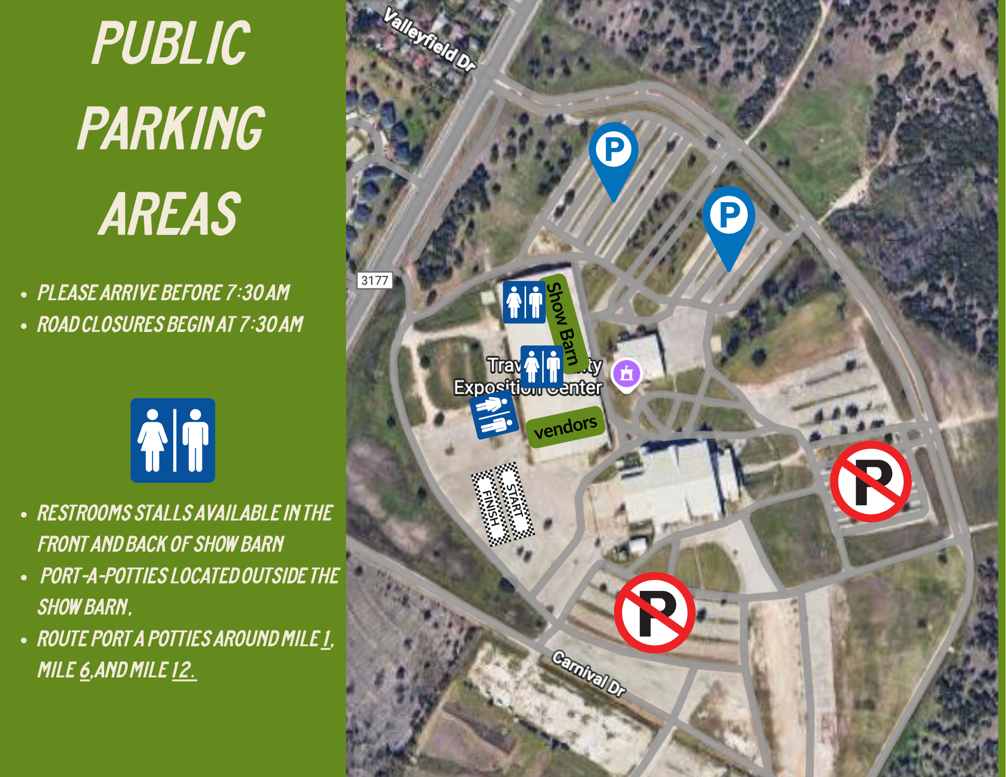 Click the links below to check out the course maps for the Half Marathon, 5K, and the Parking Map below.